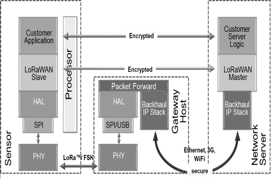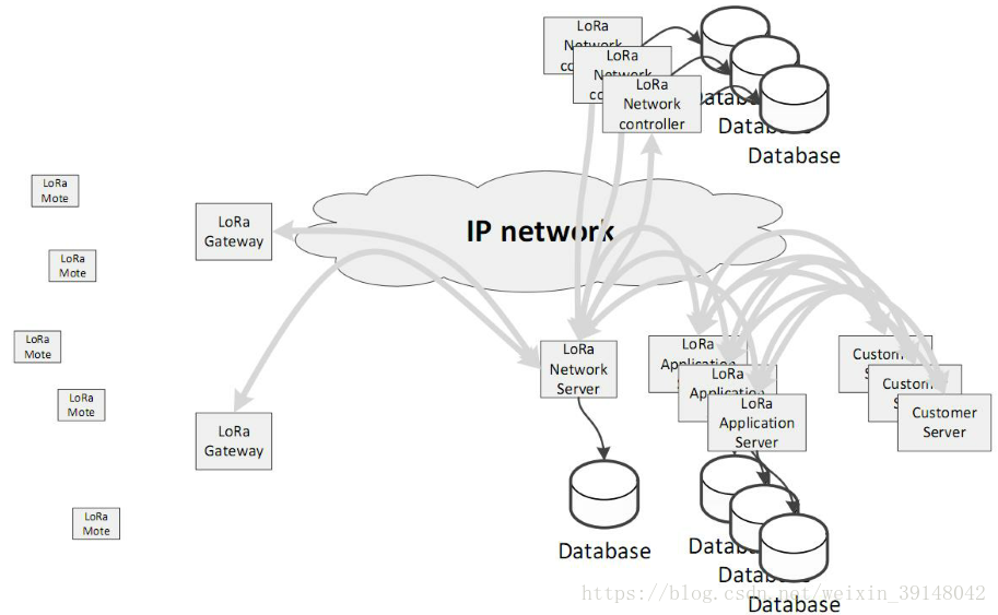 LoRaWAN采用星型无线拓扑:End Nodes(节点)、Gateway(网关)、Network Server(网络服务器)、Application Server(应用服务器)