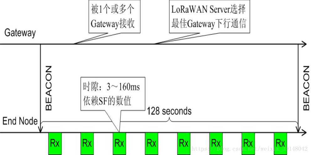 LoRaWAN终端Class B:(当需要节点去响应实时性问题的时候,首先网关会发送一个信标,告诉节点要加快通讯,快速工作,节点收到信标之后,会在128秒内去打开多个事件窗口,每个窗口在3-160ms,在128秒内可以实时对节点进行监控)