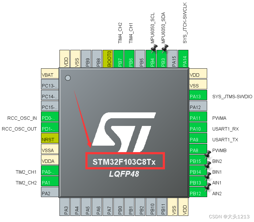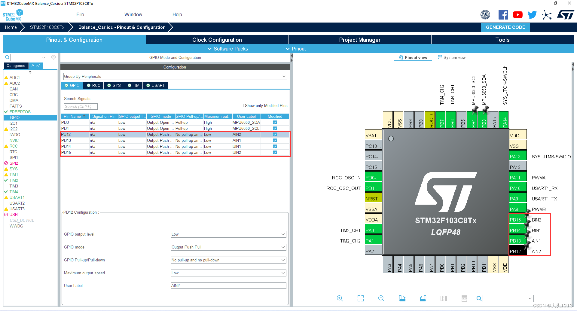 这里的PB12PB13PB14PB15控制电机正反转,我备注了AIN12、BIN12,代码也会有修改,嫌麻烦的可以不用备注。
