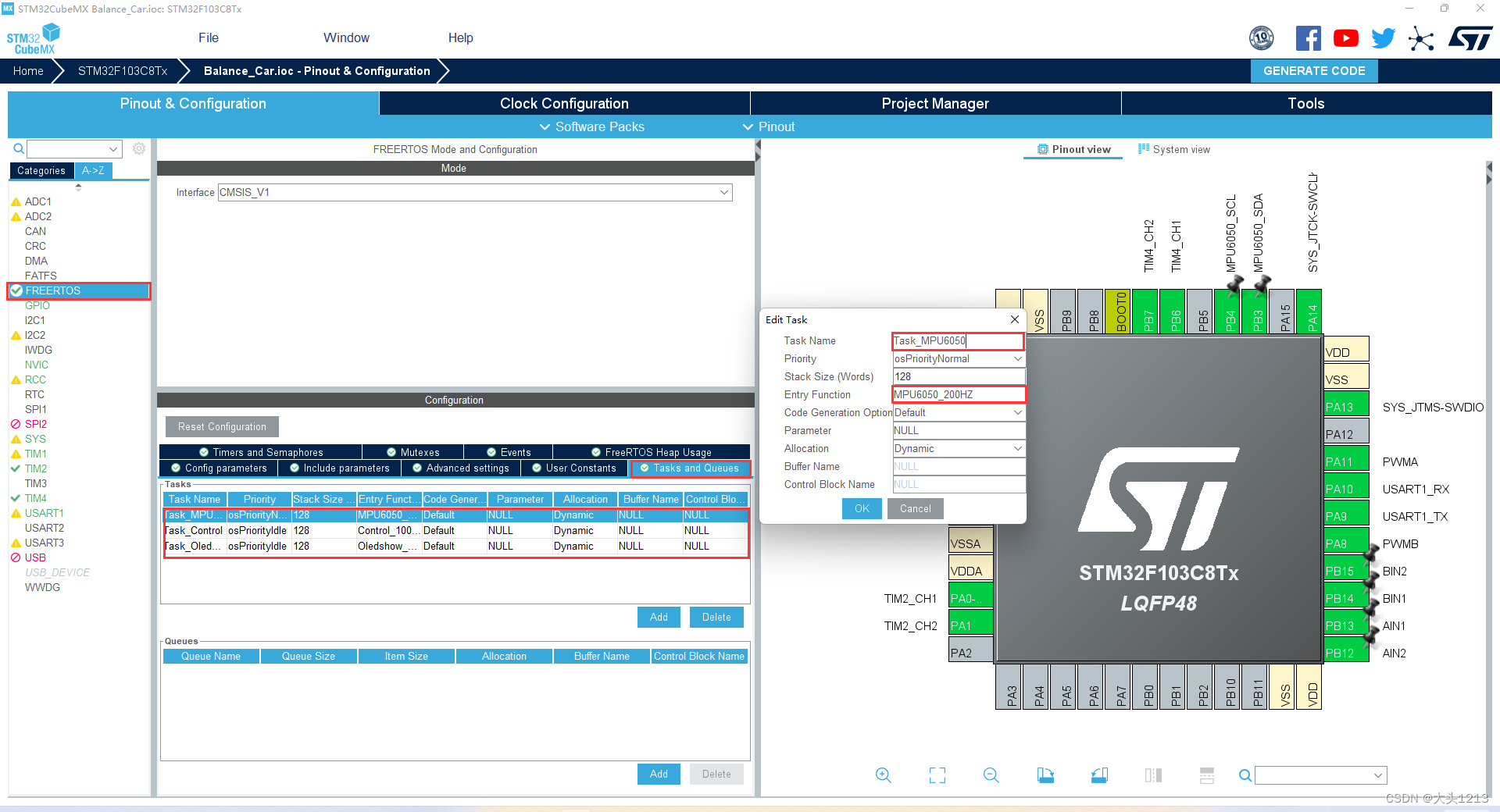这里我FreeRTOS配置了3个进程,分别是Task_MPU6050、Task_Control、Task_Oledshow,入口函数分别是MPU6050_200HZ、Control_100HZ、Oledshow_5HZ,这个自己设置就好,无关紧要。