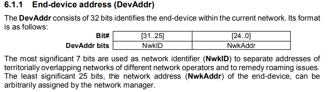 ——在 LoRaWAN 中,每个 node 有一个 4 字节的地址(DevAddr)。它由 server 分配。参见LoRaWAN规范,如下截图: