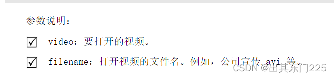 VideoCapture 类的构造方法 VideoCapture()不仅能够完成摄像头的初始化工作,还能够完成视频文件的初始化工作。当 VideoCapture()用于初始化视频文件时,其语法格式如下:
