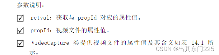 在实际开发中,有时需要获取视频文件的属性。为此,VideoCapture 类提供了 get()方法。get()方法的语法格式如下:
