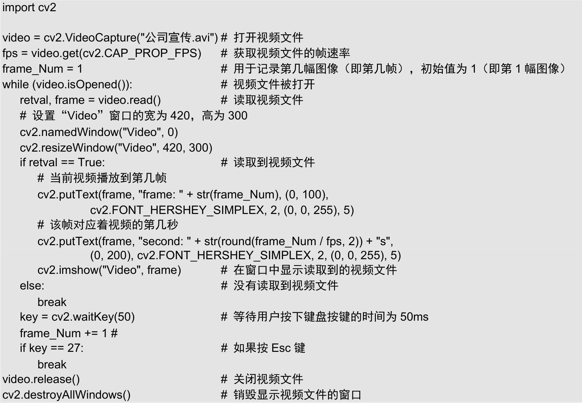 调整 waitKey()方法中的参数值可以控制视频文件的播放速度。例如,当代码为 cv2.waitKey(1)时,等待用户按下键盘的时间为 1ms,视频文件的播放速度非常快;当代码为 cv2.waitKey(50)时,等待用户按下键盘的时间为 50ms,能够减缓视频文件的播放速度。