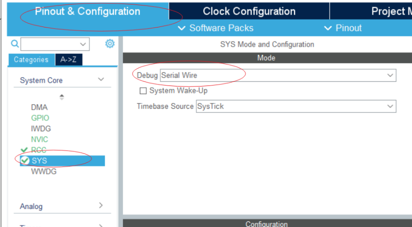 在Pinout & Configuration中的System Core配置SYS的时候将Debug选择成Serial Wire 。