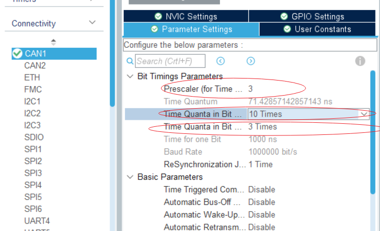 can外设的通信速率最大是1MHZ,因此我们需要调节CAN外设分频系数、BS1段长度、BS2段长度来把波特率调到1Mhz。