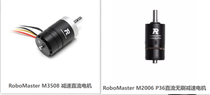 提供动力的电机现在在RM有两种,一种是M3508减速直流电机,一种是M2006 P36直流无刷减速电机。前者扭矩更大,一般被用作轮子的驱动;后者往往用来做播弹系统的动力来源。
