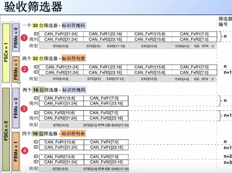标识符列表模式下,CAN_FxR1 和 CAN_FxR2中都是要匹配的标识符,收到的帧的标识符必须与其中一个吻合才能通过过滤