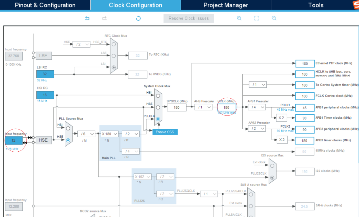 f4系列的时钟树相较于f1系列明显长的更大,更复杂,先粗浅的配置它一下,之后有对时钟特殊的要求的时候再进行仔细的配置和了解。之前的f1的外部晶振时钟是8MHZ的因此左侧标红的区域(Input frequency)选择的是8。但是这个开发板的外部晶振是12MHZ的,因此就相应的选择成12。选择HSE通道,然后将系统时钟调到最大(180Mhz),直接在HCLK处填入180,Cube就会自动帮你配置。