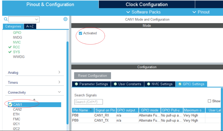 在Connectivity选项栏中选中要开启的CAN外设。点击Activated开启。