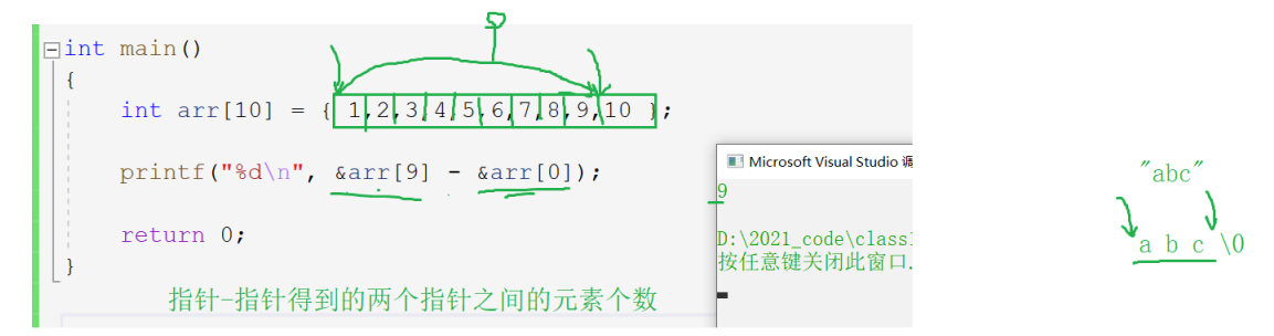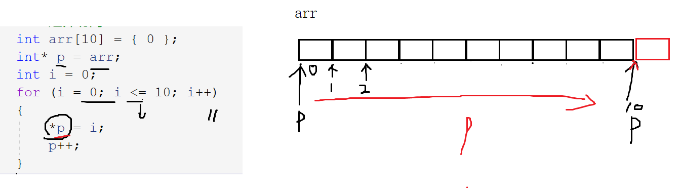 如图:在第十次 访问时,可以进入到循环,相当于从第10个点向后访问4个字节,之后的字节不属于原数组,则越界了,则称为野指针。(只有在超出范围后,在会发生崩溃)