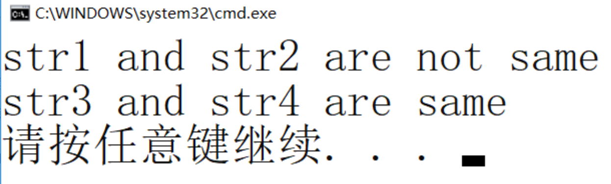 这里str3和str4指向的是一个同一个常量字符串。C/C++会把常量字符串存储到单独的一个内存区域。当几个指针指向同一个字符串的时候,他们实际会指向同一块内存。但是用相同的常量字符串去初始化不同的数组的时候就会开辟出不同的内存块。所以str1和str2不同,str3和str4不同。