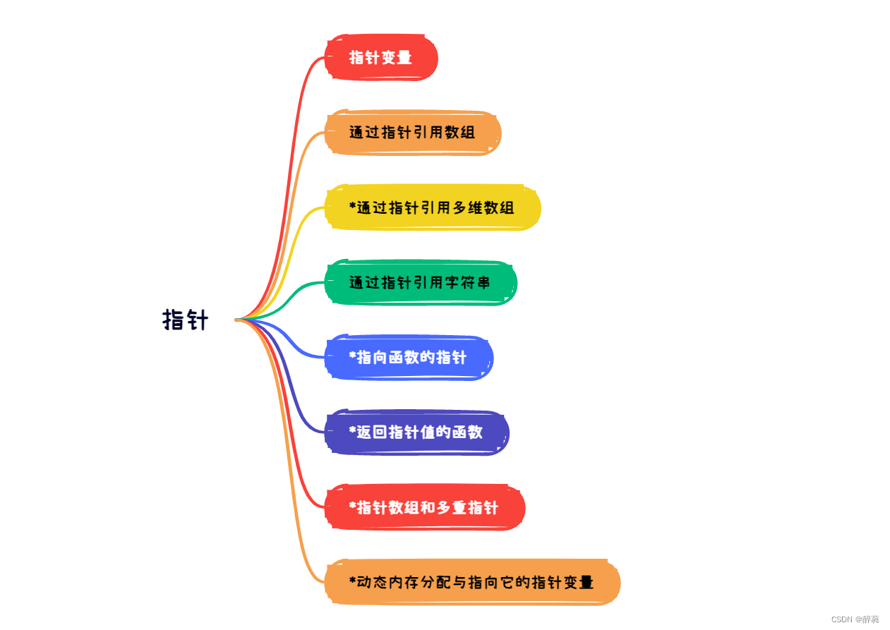 指针这里分为八个小部分,分别是“指针变量”、“通过指针引用数组”、“*通过指针引用多维数组”、“通过指针引用字符串”、“*指向函数的指针”、“*返回指针值的函数”、“*指针数组和多重指针”、“*动态内存分配与指向它的指针变量” 。