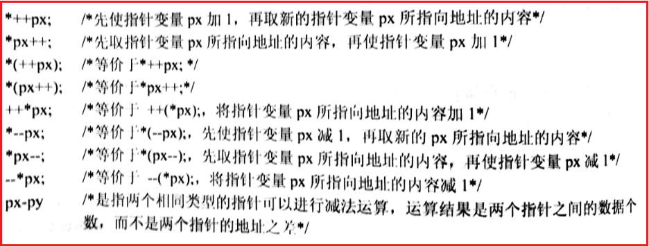 由于指针运算符*与自增运算符++、自减运算符--的优先级相同,结合方向都是从右至左,因此需要注意以下各种形式的含义不同。