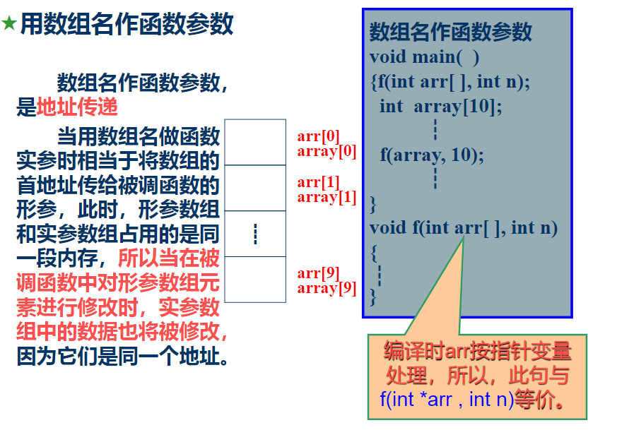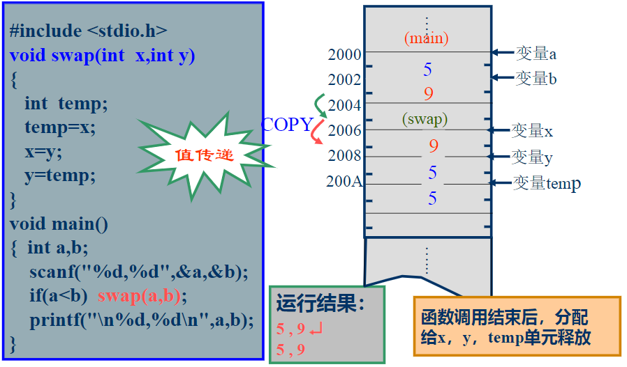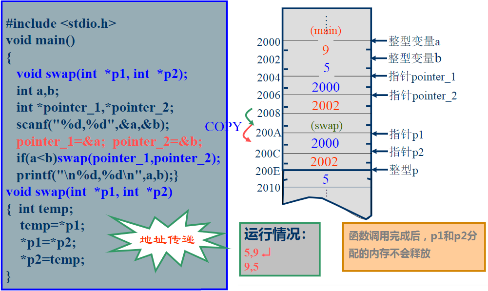 普通变量作为函数的参数传递时是按值传递,实参与形参不共享内存。指针变量作为函数参数时是地址传递,共享内存,“双向传递”。