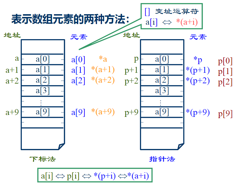 (2). 引用下标为 i 的数组元素:*(指针变量+i) 等同于 指针变量[i] 或者 指针变量[i] 等同于 数组名[i];