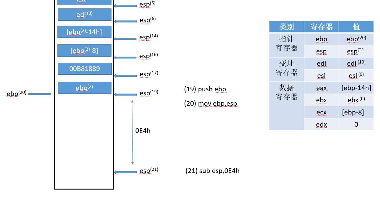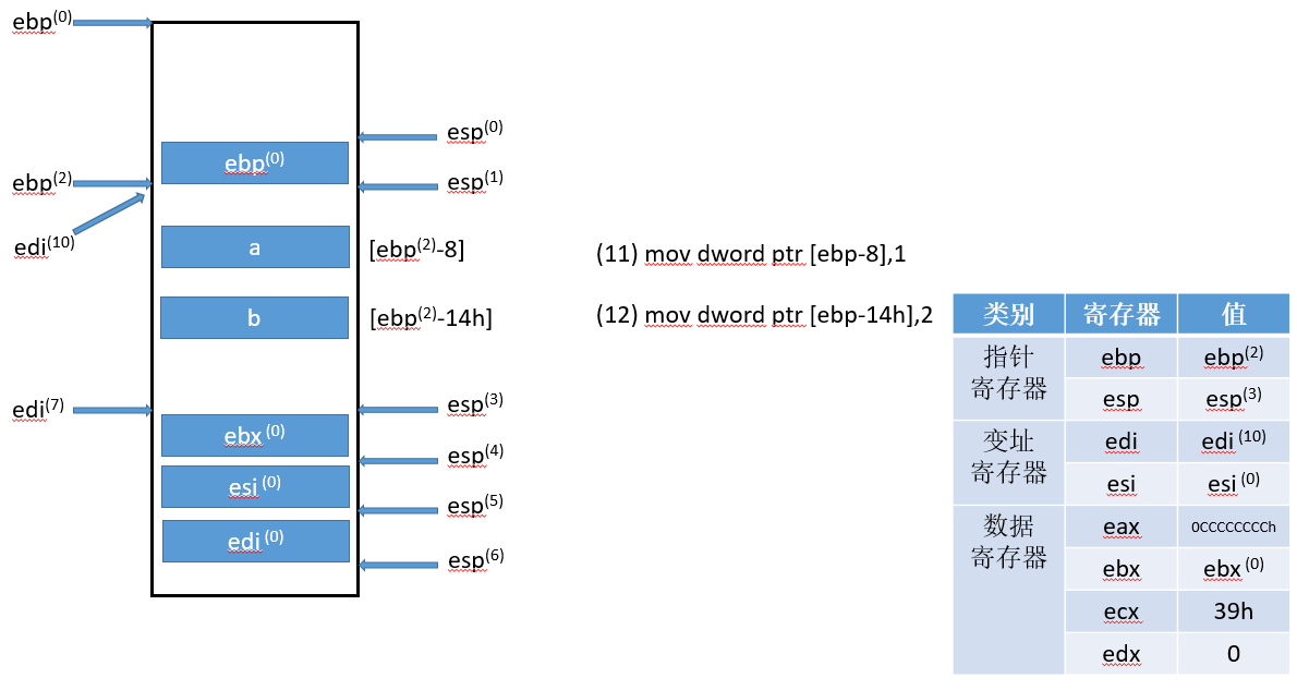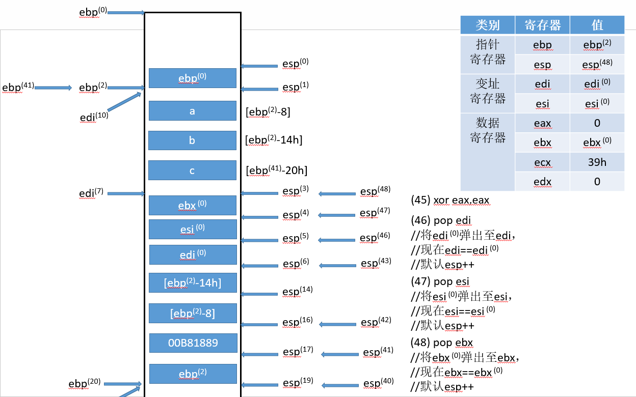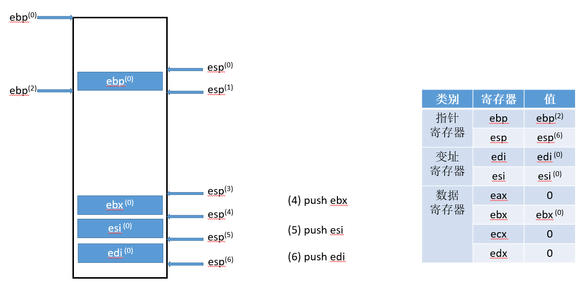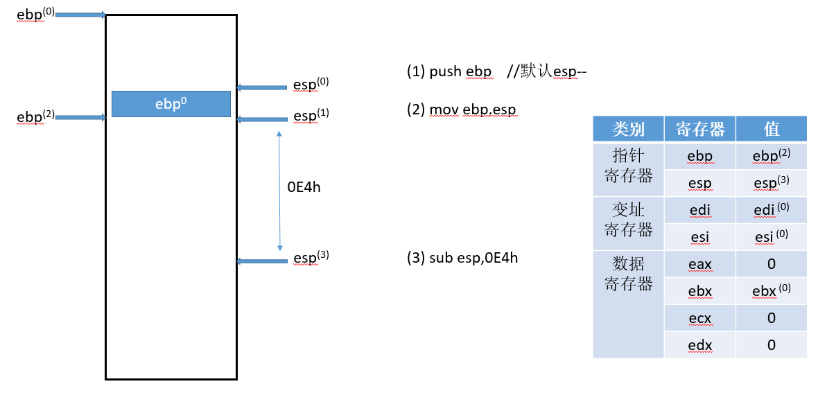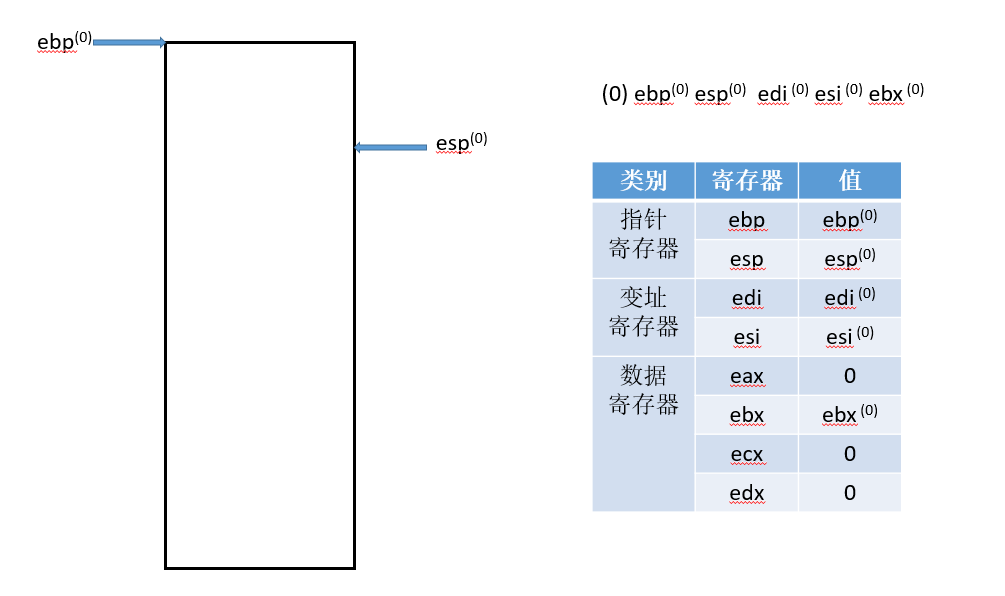 符号的右上标,比如(0),是指该变量对应流程(0)得到的结果,ebp寄存器只有一个,右上标只是标记它的状态,具体值可以对照每张图中的寄存器状态表。