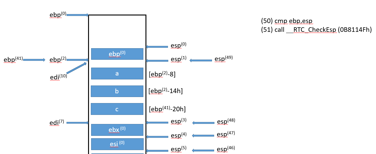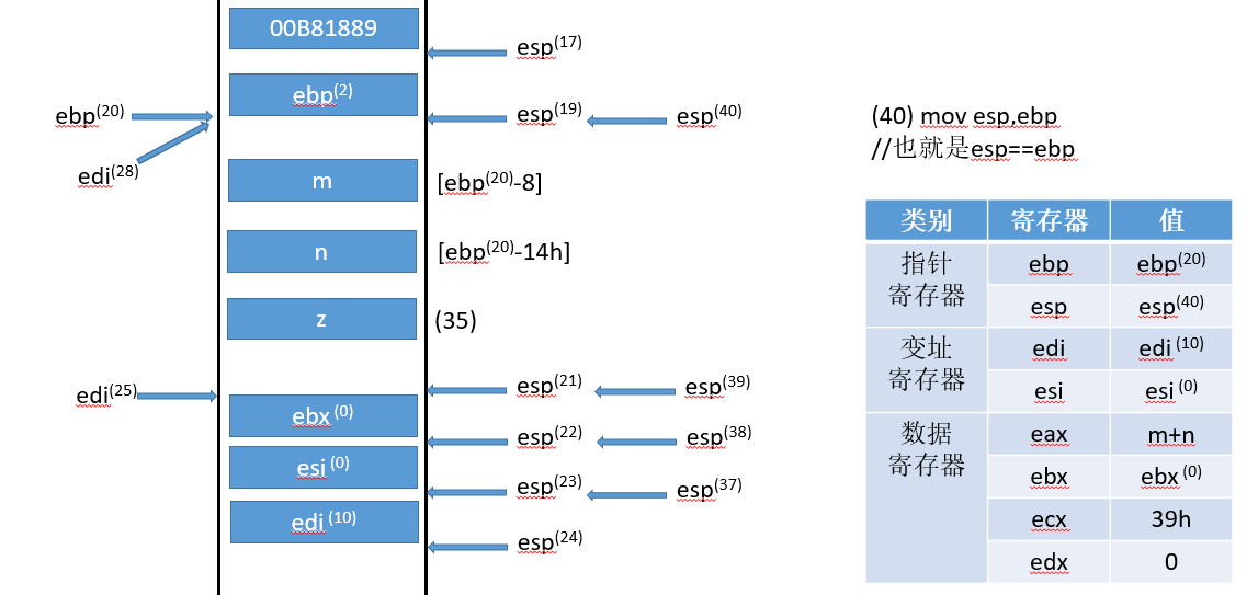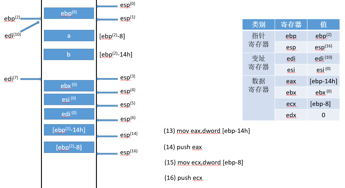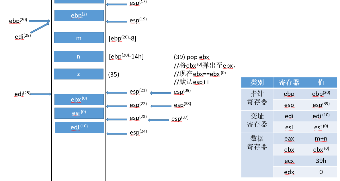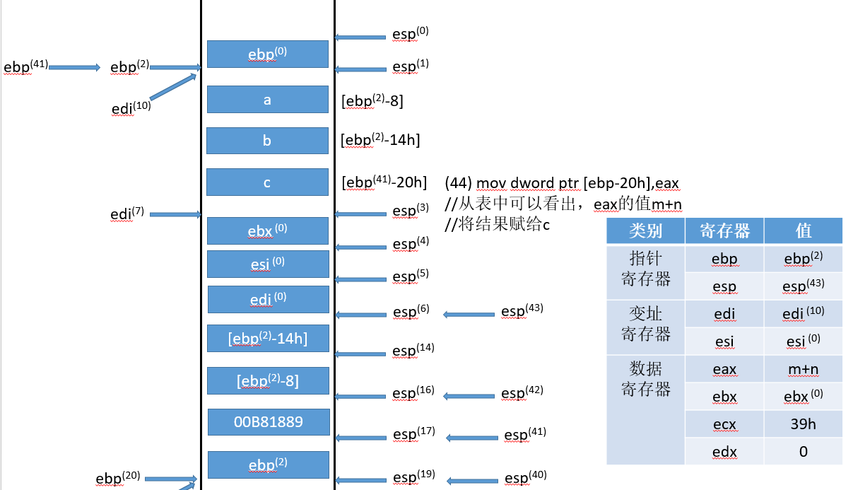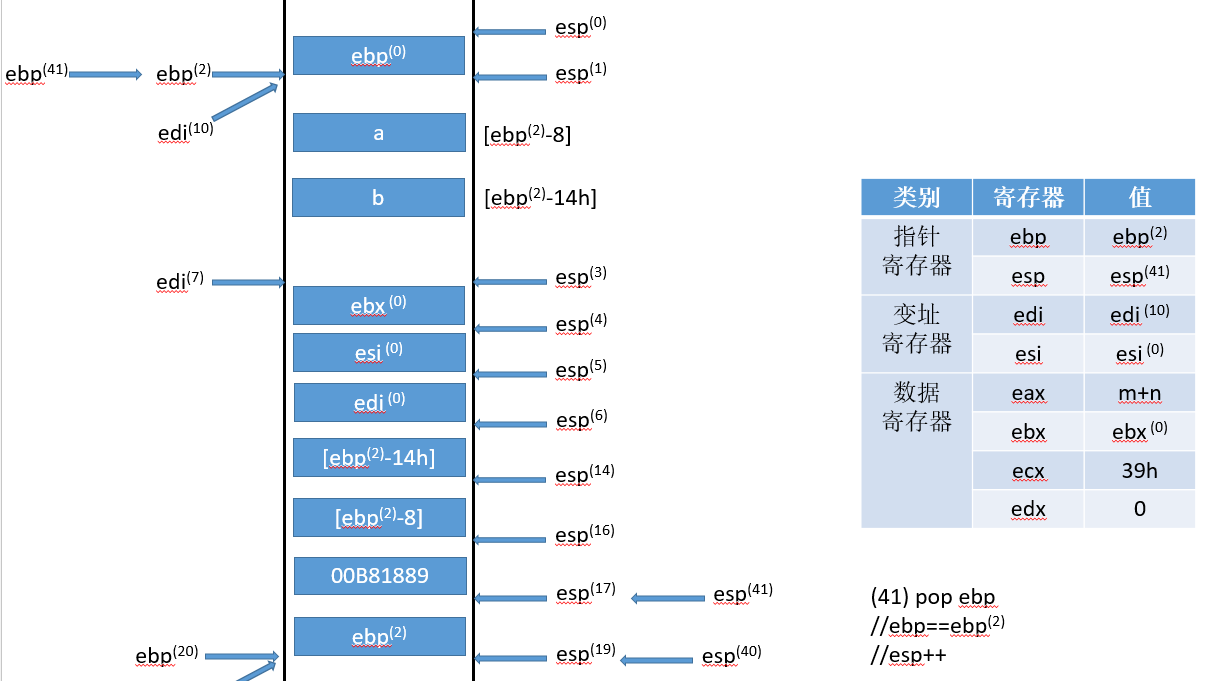 符号的右上标,比如(0),是指该变量对应流程(0)得到的结果,ebp寄存器只有一个,右上标只是标记它的状态,具体值可以对照每张图中的寄存器状态表。