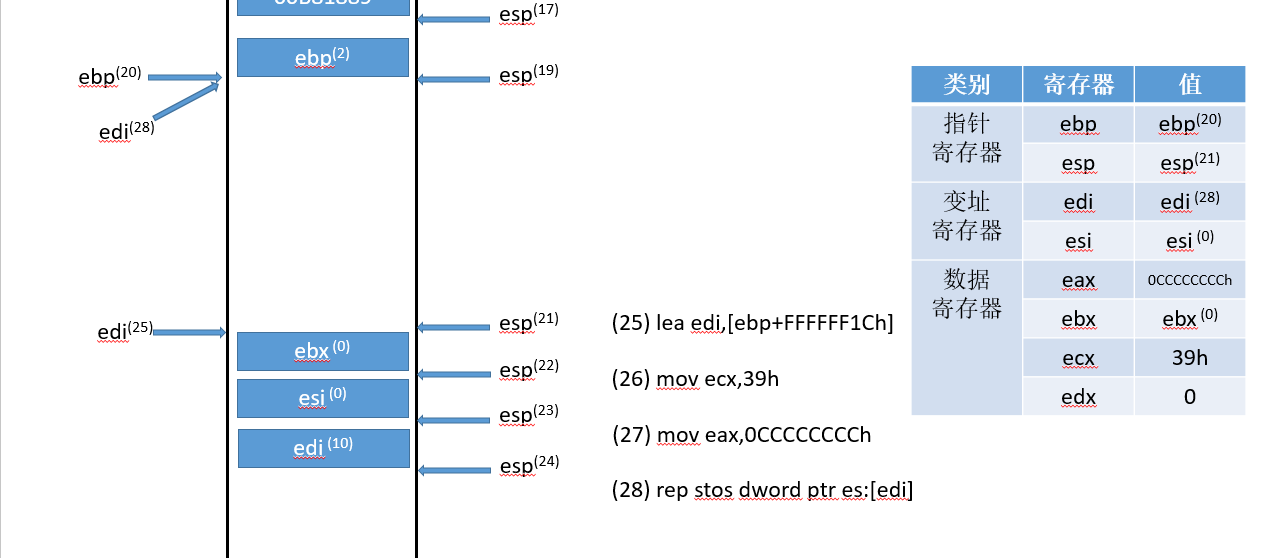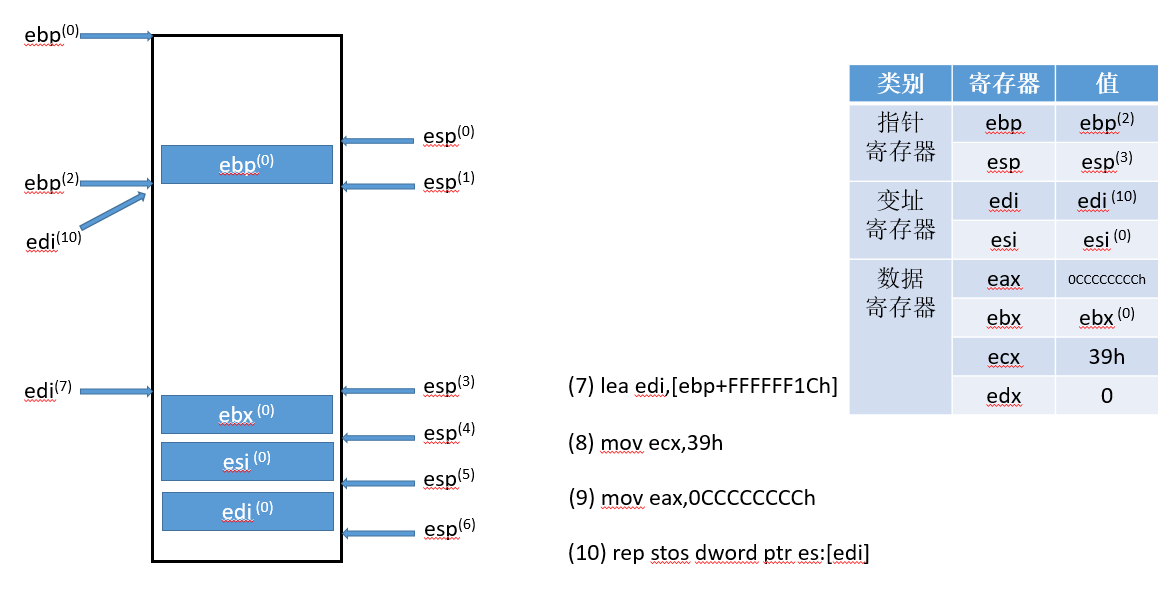 - rep stos:rep是指循环执行ecx次操作,结合stos就是将eax的值填充ecx次每次填充完就edi+=4个字节,这样就可以重定位edi==ebp,并且对栈帧做值初始化,语法如下: