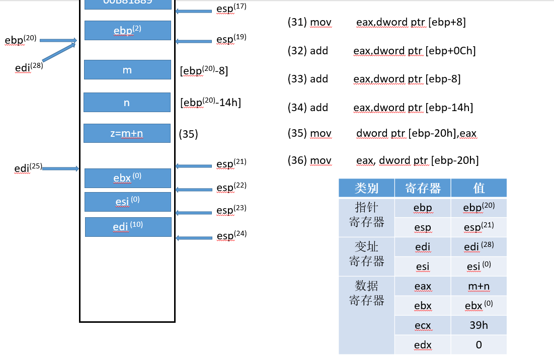 下面继续按照程序走,图中列出的指令执行的同时会改变寄存器表中相对应的寄存器