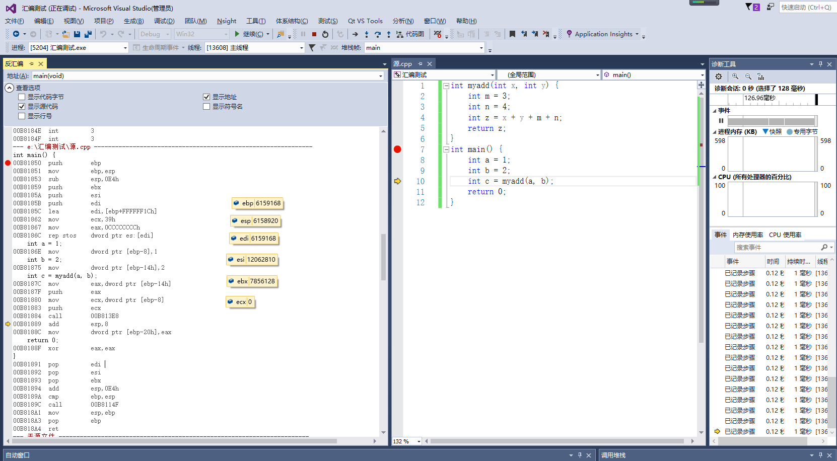 再次输入0x000A1690,回车,就会跳转到myadd函数的汇编代码