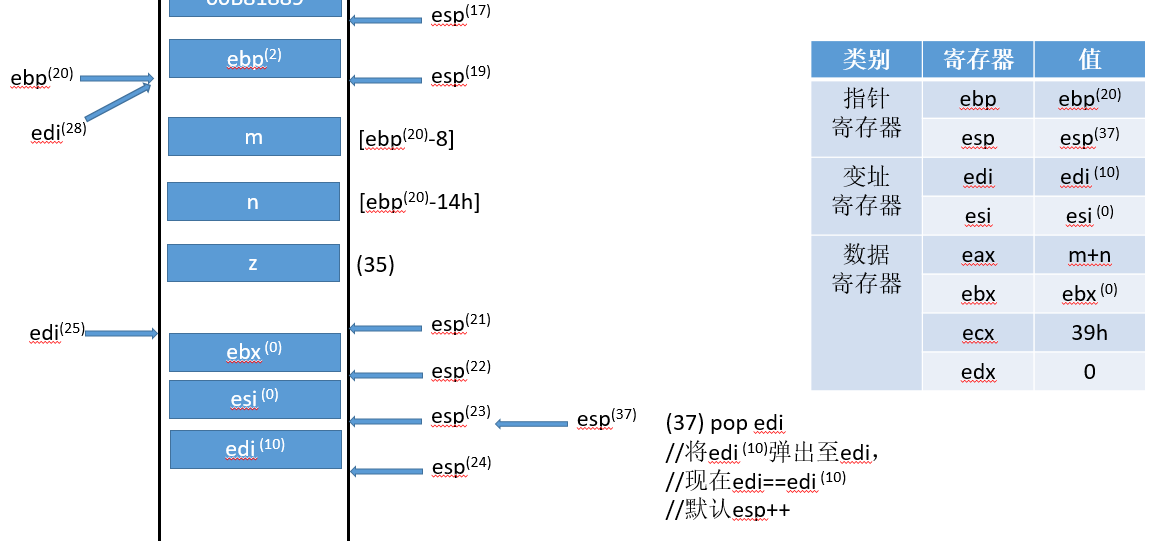 重定位edi的值,edi==当前函数的栈帧的ebp,也就是edi(10)==ebp(2)