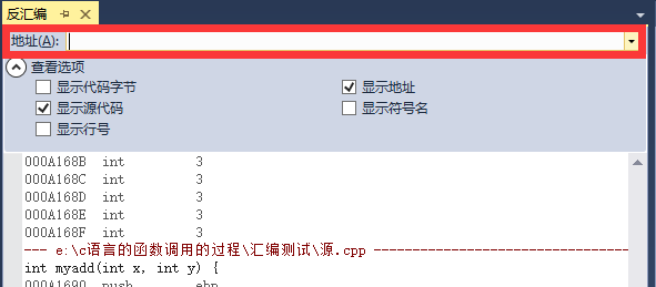 在VS中的反汇编窗口的上方有一个“地址(A)”,可以用来查看指定地址处的指令。