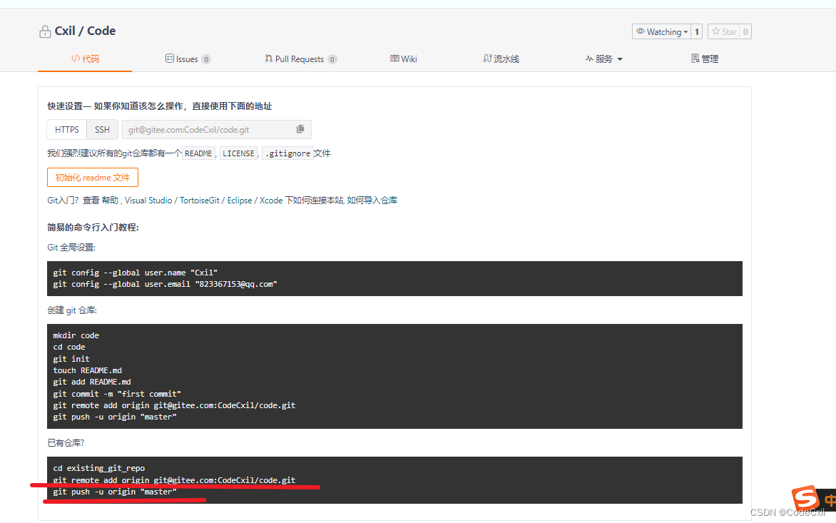 ① 执行 git remote add origin git@gitee.com:CodeCxil/code.git 添加相关的云仓 此命令可以建立好云仓之后可以看见