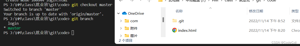 ③再通过执行 git checkout master 切换回主目分支就会发现,主分支下不存在login文件,这样可以保证主分支的文件不会紊乱,最后我们通过合并分支来更新代码的迭代。