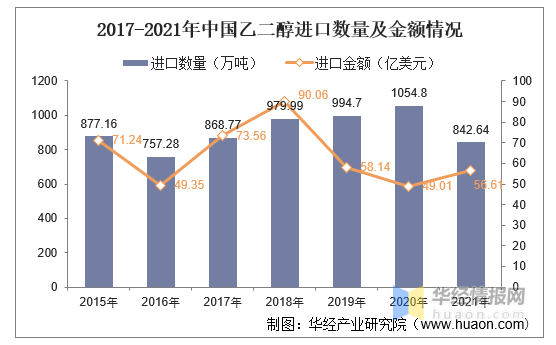 “乙二醇”海关编码为“29053100”。从进出口情况来看,由于国内乙二醇生产成本较高,产能利用率相对较低,进口需求大于出口。据统计,2021年我国乙二醇进口数量为842.64万吨,进口金额为56.61。