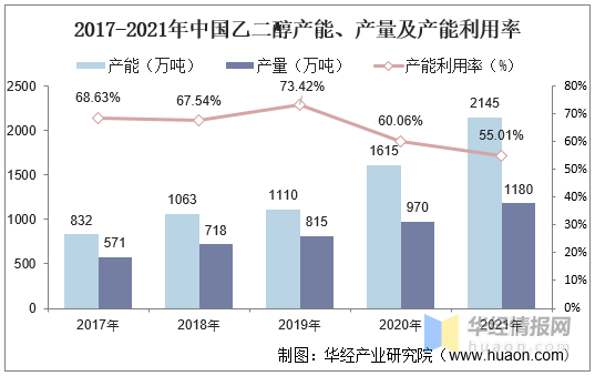 2017-2021年中国乙二醇产能、产量及产能利用率