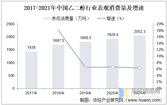 2017-2021年中国乙二醇行业表观消费量及增速