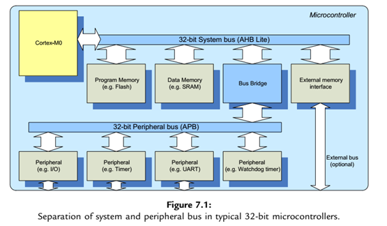 系统总线基于AHB_Lite高级高性能总线协议。外设总线基于APB高级外设总线协议,通过一个转换桥连接到AHB上,这只是Cortex-M0内核的大概模式.