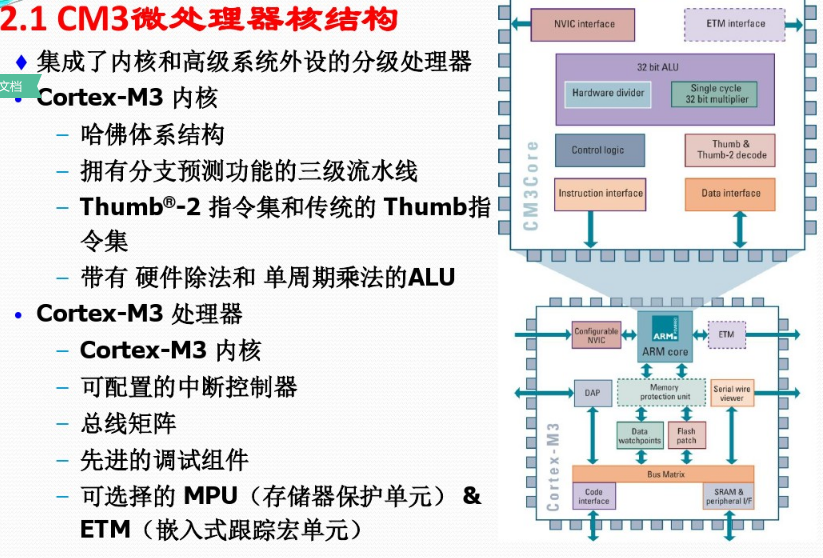 ARMCortex-M3采用哈佛结构,并选择了适合于微控制器应用的三级流水线,但增加了分支预测功能。