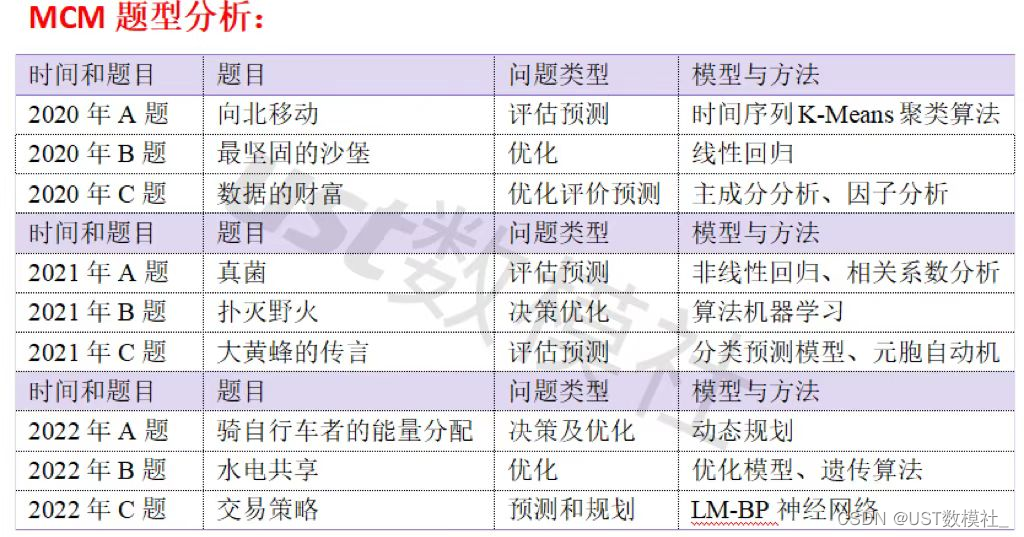 原来的E题,从环境科学题变成了环境可持续,其他的题目暂时不变,我们分析近几年的美赛赛题,可以得到如下表: