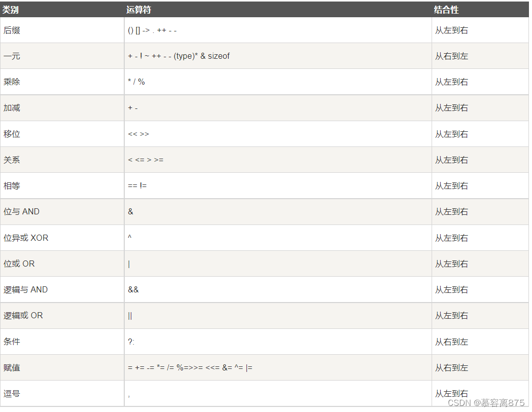 下表将按运算符优先级从高到低列出各个运算符,具有较高优先级的运算符出现在表格的上面,具有较低优先级的运算符出现在表格的下面。在表达式中,较高优先级的运算符会优先被计算。