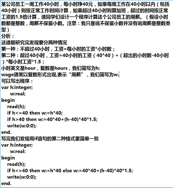 某公司员工一周工作40小时,每小时挣40元,如果每周工作在40小时以内(包括40小时)则按正常工作时间计算,如果超过40小时则算加班,超过的时间按正常工资的1.5倍计算,请同学们设计一个程序计算这个公司员工的周薪。(假设小时数都是整数,周薪不保留小数。注意:我只是说不保留小数并没有说周薪是整数类型)