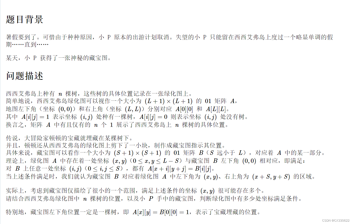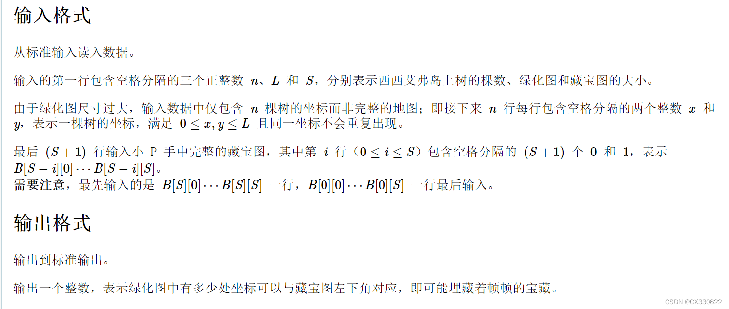 这道题我最初的思路是,以数组形式分别存储绿化图和藏宝图,然后从绿化图的(0,0)位置开始便利,如果没有超出绿化图范围,并且藏宝图完全符合绿化图,那么结果+1。但是由于L的取值过大,只能AC 70%。代码如下: