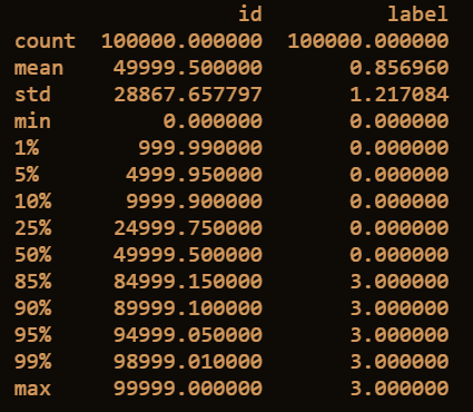 - describe种有每列的统计量,观察数据是否异常值和缺失值。比如分位数值相差太大则有异常值,或发现999 9999和-1 等值则有缺失值。
