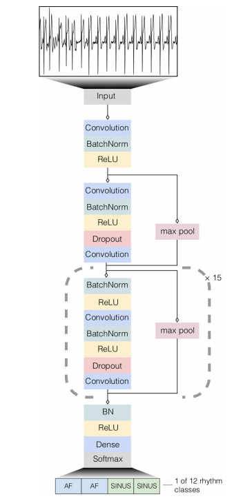 上图为深度神经网络结构。我们的深度神经网络由33个卷积层和一个线性输出层组成。该网络接受原始心电图数据作为输入(以200hz或每秒200个样本采样),并每256个输入样本输出12个可能的心律类别中的一个。