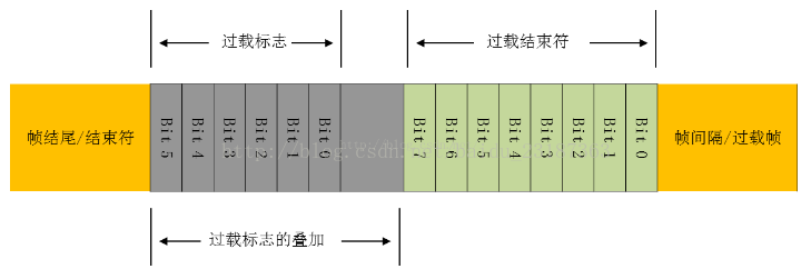 过载条件:接收器要求延迟下一次数据帧或远程帧的到达;在帧间隔间歇场的第一位和第二位检测到显性位;如果CAN节点在错误界定符或过载界定符的第8位采样到一个显性位,则节点会发送一个过载帧,错误计数器不会增加。