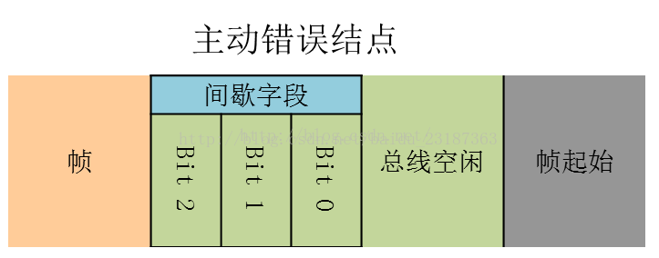 数据帧和远程帧的前面必然有帧间空间。对于主动错误节点和被动错误节点,帧间空间的结构稍有不同。对于主动错误节点,帧空间由3个显性位的间歇字段和总线空闲组成。在间歇字段不允许发送数据帧和远程帧。总线空闲的长度任意,当有显性位时就被认为是帧起始。被动错误标志除了上边两部分外,在间歇字段后还有8个显性位的挂起传输。在挂起传输阶段被动错误节点不可以发送数据帧与远程帧。