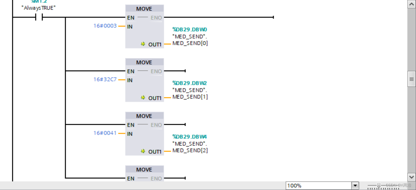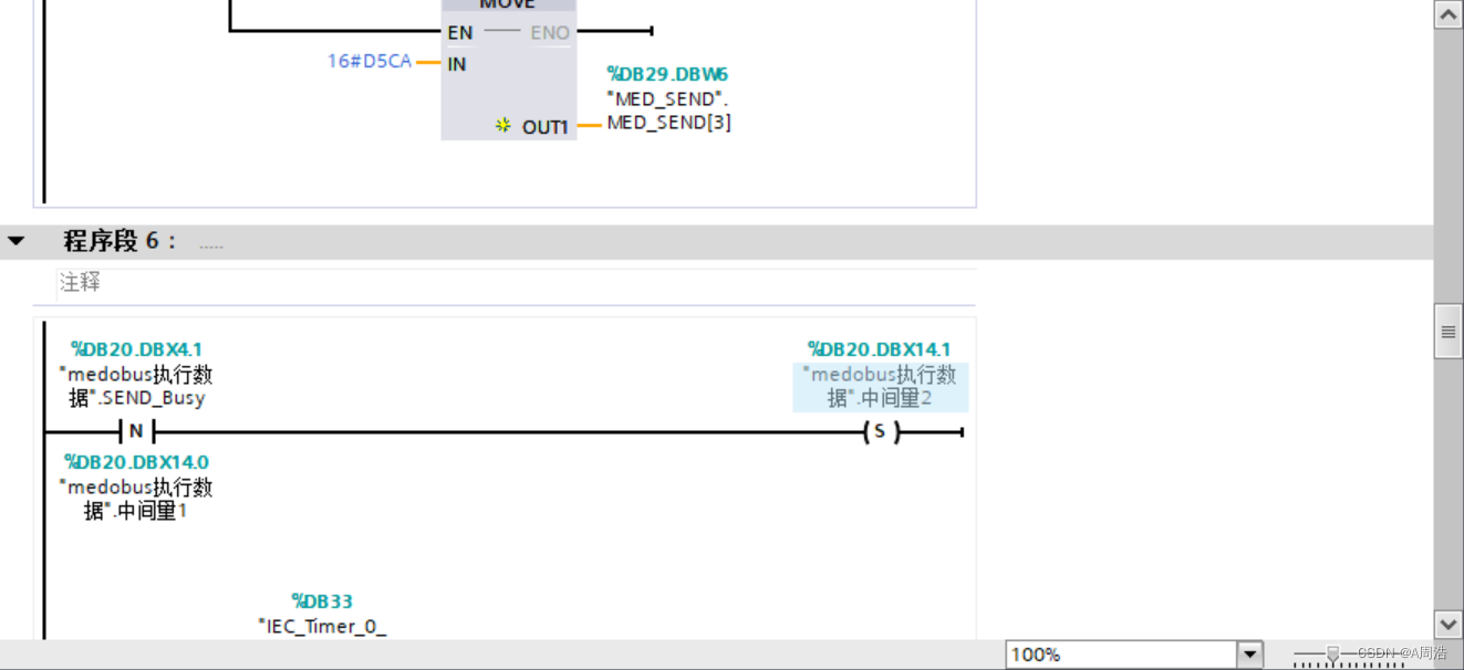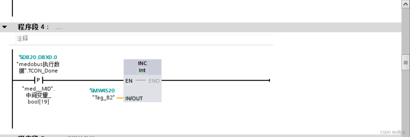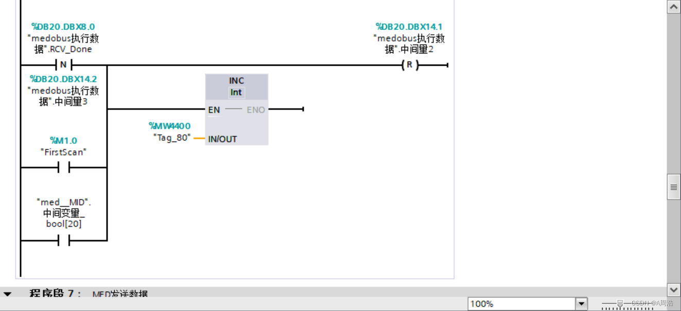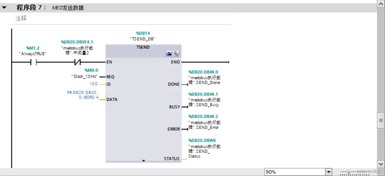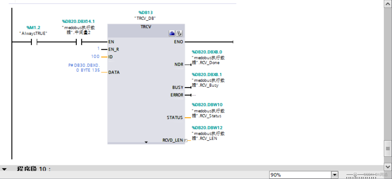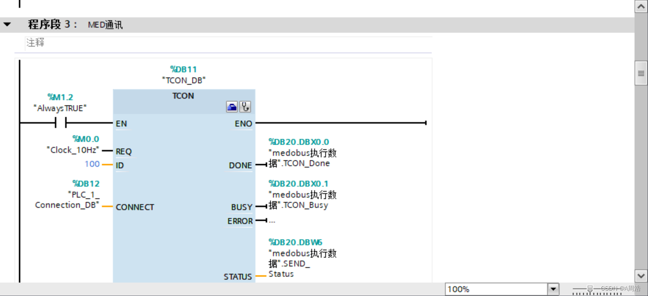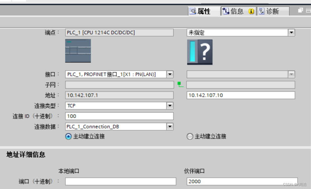 创建TCP通讯,并设置好IP,主从站,连接号、以及端口号;本例1200端为主站即客户端,读取安川PLC传过来的信号,最终数据放在“上位机读取值.数据”DB块中。