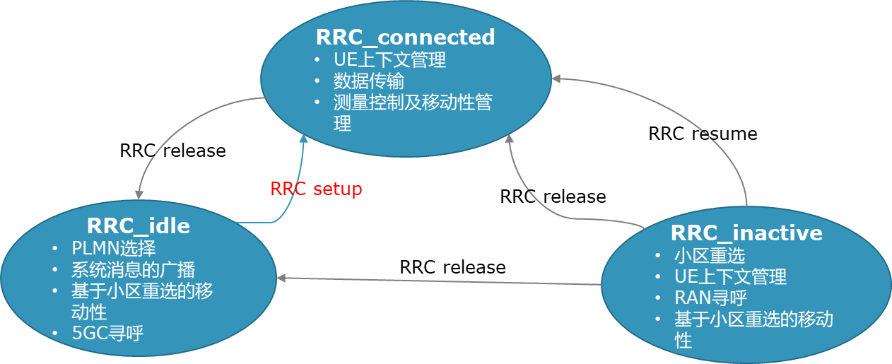 参考3GPP 38.300,UE的RRC状态分为:RRC空闲态(RRC_IDLE)、RRC连接态(RRC_CONNECTED)、RRC非活动态(RRC_INACTIVE)。