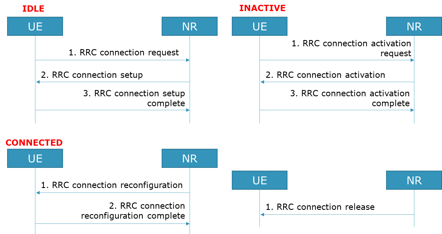 | 连接状态AS层(RRC) | IDLE和CONNECTED | IDLE、CONNECTED和INACTIVE | |