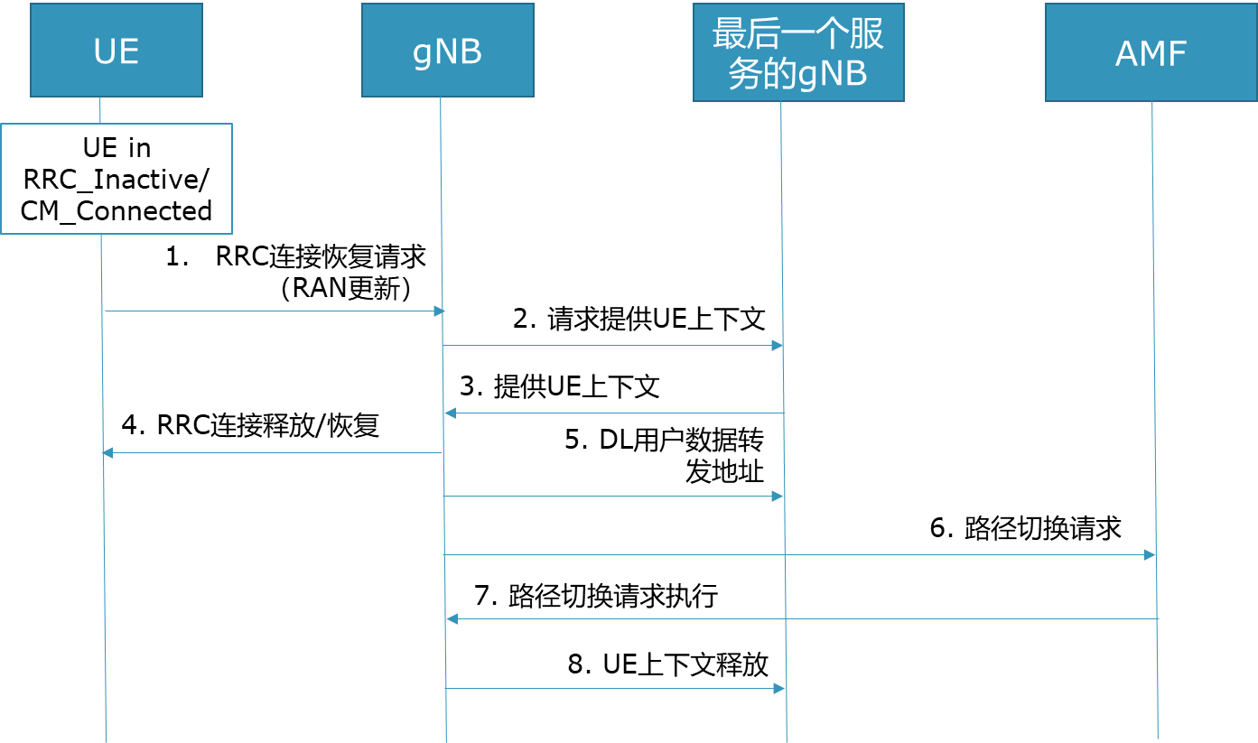 4:gNB可将UE移动到RRC_Connected,或将UE发送回RRC_Inactive状态,或将UE发送回RRC_Idle状态,如果发送回RRC_Idle态就不需要以下步骤;