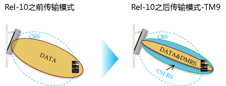 在3GPP Rel-10之前,LTE空口只用一种小区级导频CRS,同时处理信道测量/反馈以及数据解调。多天线技术传播的传播中,每个天线信号的传播途径都不同,为了对每路天线传播信道进行准确测量,需要为每一个天线端口分配一组CRS资源。随着天线端口数的增多,导频对空口资源的开销就越来越大,2端口时,导频资源开销占9.5%,4端口时,导频的资源开销占14.3%,天线发展到8端口及以上时,导频开销已经无法支撑多天线技术所带来的增益,从而,CRS最大只支持到4端口。TM9将信道测量/反馈和数据解调的导频分开,改为2个新的参考信号CSI-RS和DMRS,CSI-RS负责信道测量/反馈,DMRS负责数据解调。导频分开的好处是CSI-RS可以用较少的空口开销满足信道测量/反馈的要求,而DMRS只需要伴随数据随路发送,按需分配。因此TM9的引入能突破导频对天线端口数的约束,达到8端口以上,并持续向更多端口数演进。