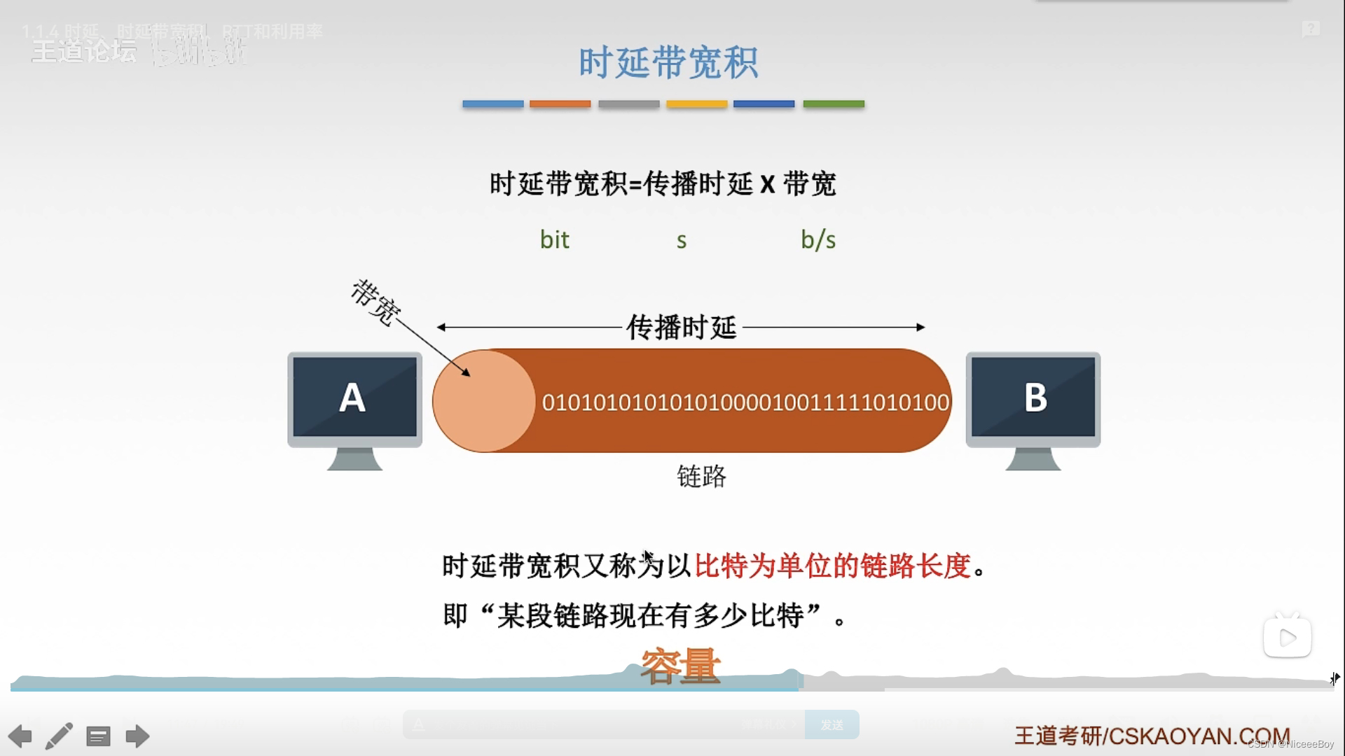 时延带宽积又称为以比特为单位的链路长度。即“某段链路现在有多少比特”。(容量)