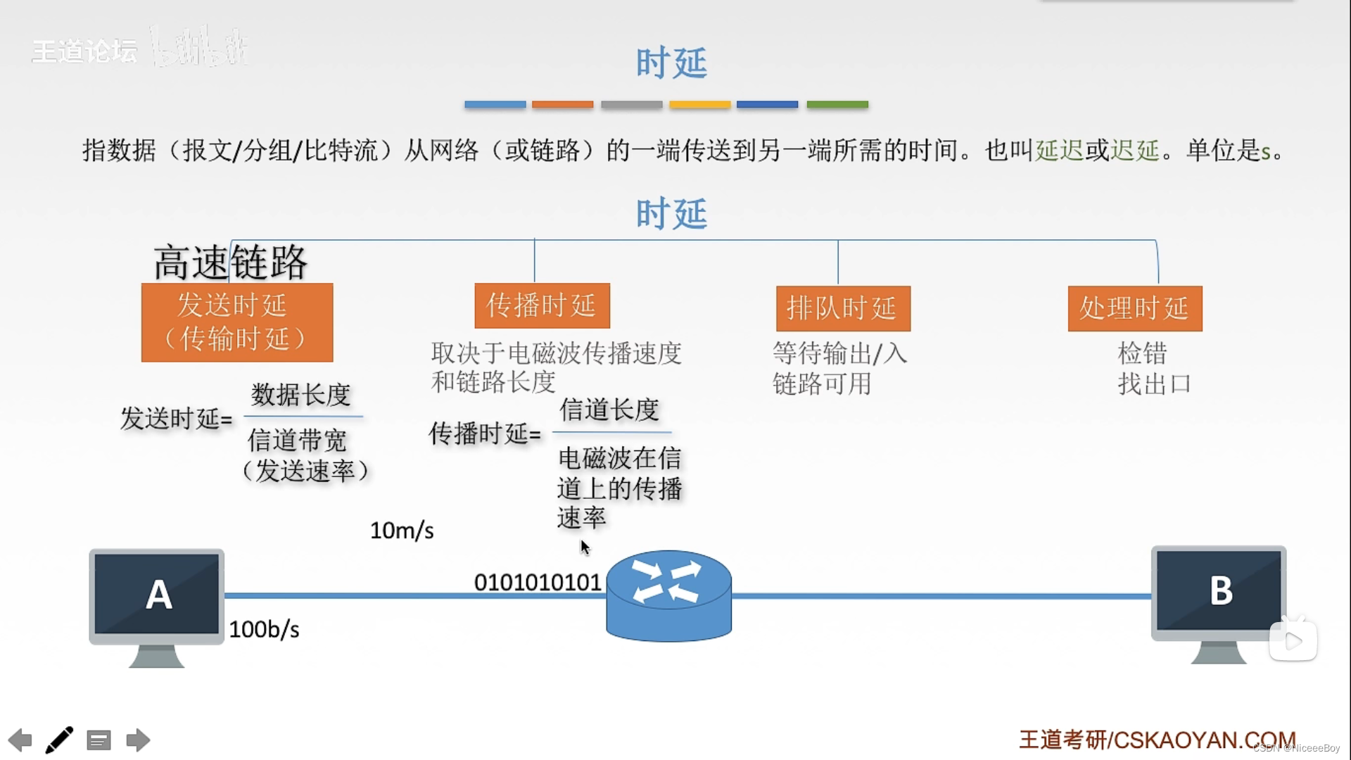 时延:指数据(报文,分组,比特流)从网络(或链路)的一端传送到另一端所需要的时间。也叫延迟或迟延。单位是s。