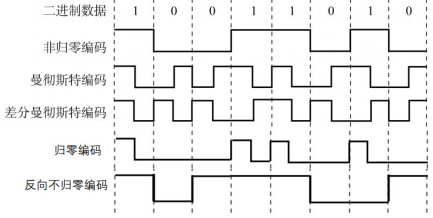 - 非归零编码(NRZ)与RZ编码的区别是不用归零,一个周期可以全部用来传输数据。